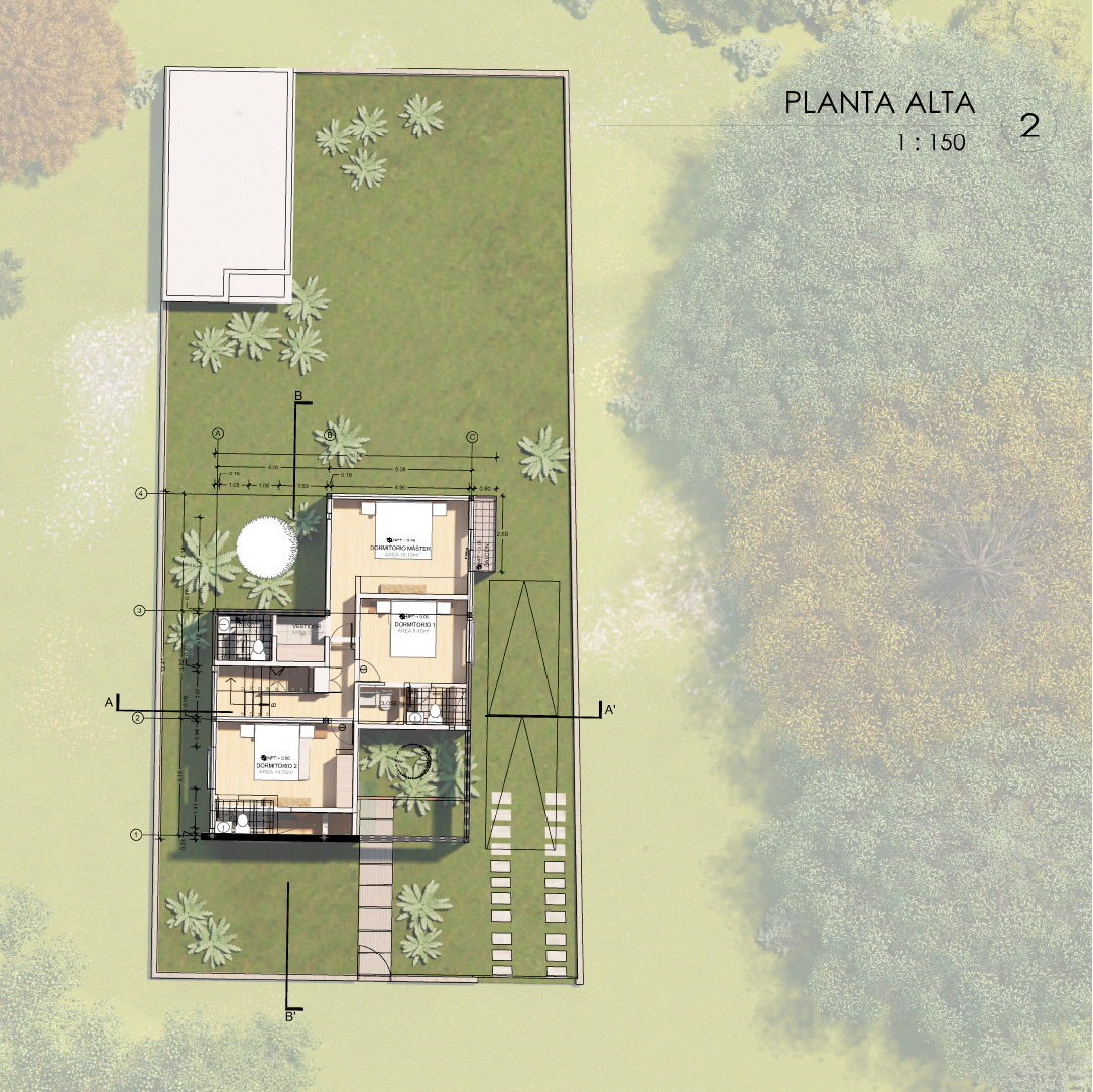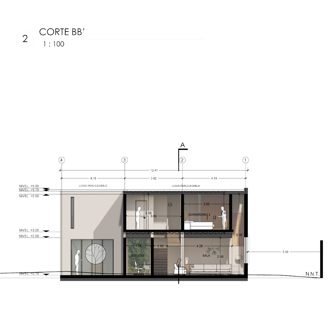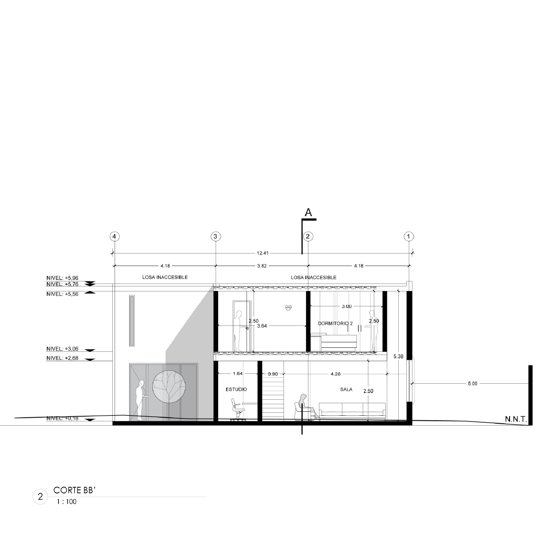 Este proyecto es una vivienda ubicada dentro de un sector periurbano, en la que por precauciones de seguridad no se puede mostrar como arquitectónicamente se quisiera, por precautelar la integridad de sus habitantes. Cuenta con un terreno amplio que necesitó ser preservado para garantizar áreas verdes amplias. Tiene la estructura de vivienda de conjunto residencial a partir de un cubo desfasado, que genera dos espacios al frente y al posterior, el primero funciona como un preámbulo al ingreso, marca una ruptura visual con el entorno exterior y da la bienvenida generando un recibidor a partir de la estructura metálica vista sobre la que fue construída, genera un volado figurativamente suspendido en el aire con celosía de ladrillo; el segundo funciona como un patio cubierto y zona de parrilla cubierto por una pérgola, ideal para compartir con familia. Cuenta con tres dormitorios completos ubicados en la segunda planta, los cuales reciben luz y calor al amanecer y al atardecer, lo cual garantiza condiciones térmicas ideales a toda hora. En la planta baja se encuentran la cocina, comedor, sala, baño social y un estudio. Es un programa amplio optimizado funcionalmente en dos plantas de 85 metros cuadrados, que generan la apariencia de una casa más grande de su tamaño real.