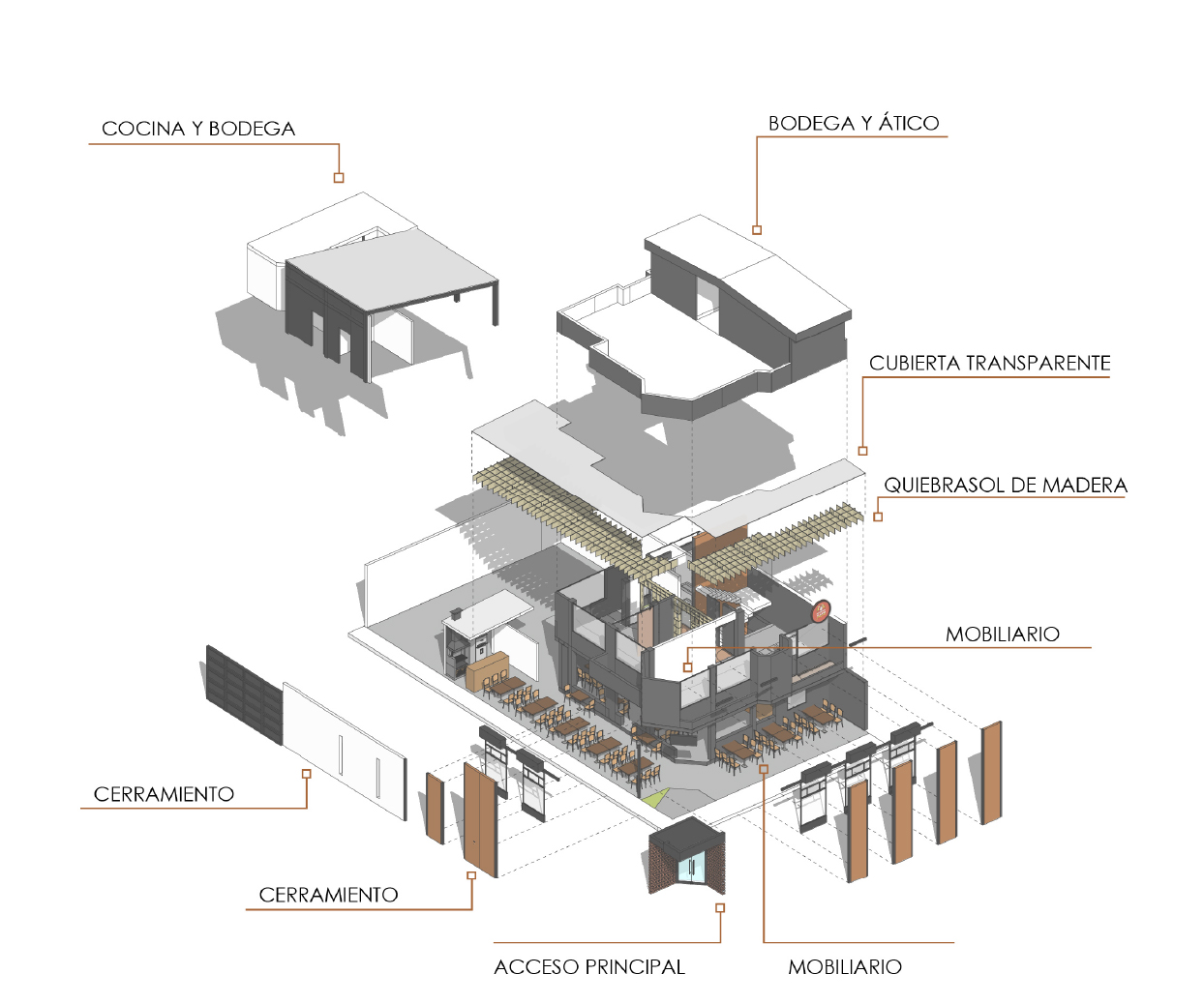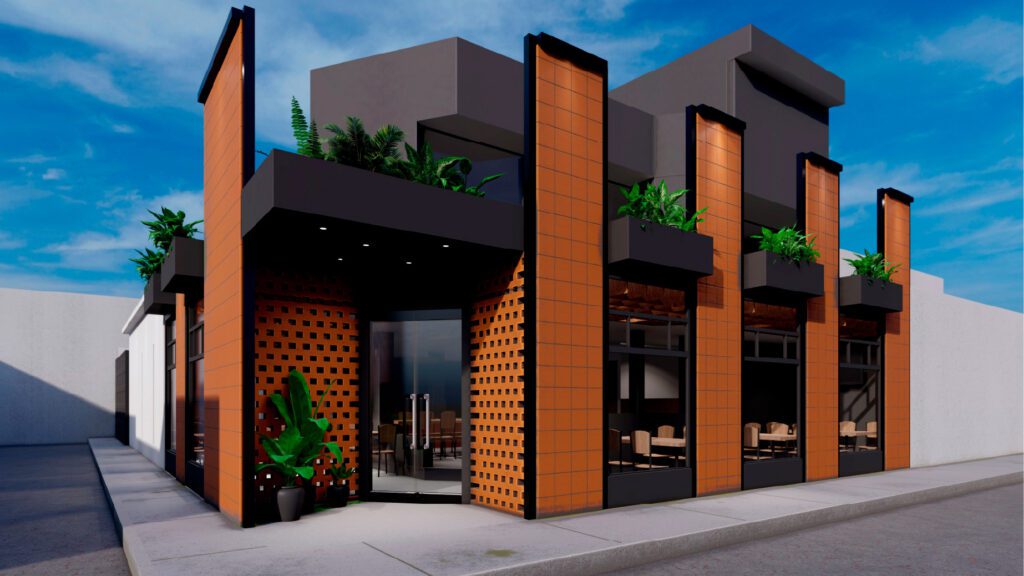 Es un proyecto realizado sobre la base de una construcción de vivienda, es decir, es un reciclaje de estructura que impuso el reto de aprovechar espacios de vivienda como los patios, generar una fachada envolvente y atractiva que sea el foco de atención y que minimice la construcción, la cual fue pintada de negro; como elemento principal de la fachada propusimos seis paredes elevadas de mampostería rústica y tejuelo, que le otorgan personalidad y marcan el estilo del restaurante, siendo un distintivo único entre las construcciones del sector. Al ingreso, puertas de vidrio y un muro de ladrillo visto generan una cálida bienvenida. En el interior del restaurante se planteó la utilización de los patios circundantes para extender el área de mesas para atención al cliente. Para cubrir el área y generar un ambiente térmico, se utilizaron pérgolas sobre la base de estructura metálica vista que aportan estéticamente al ambiente interno del restaurante.