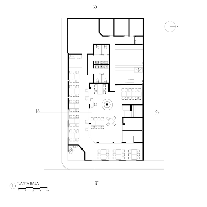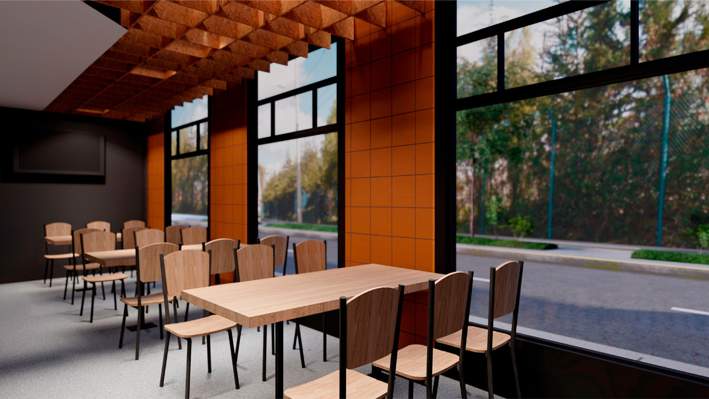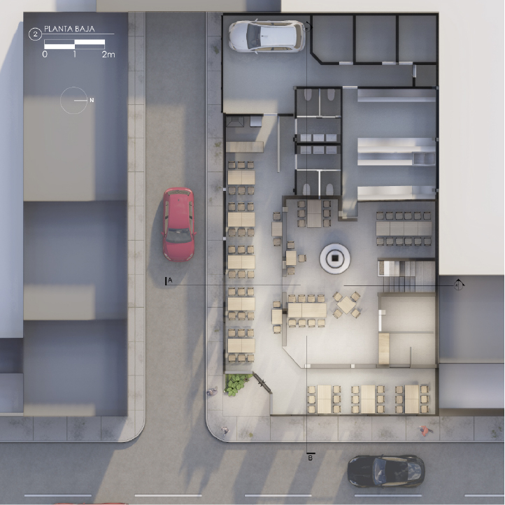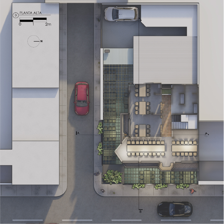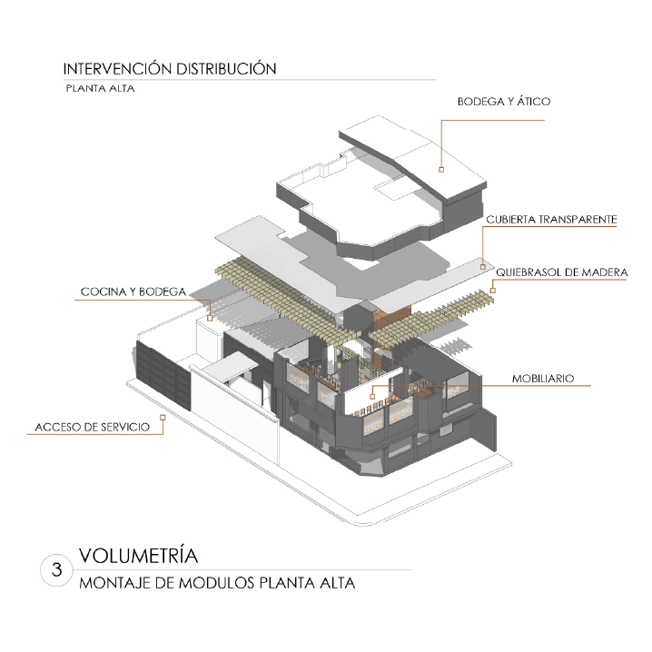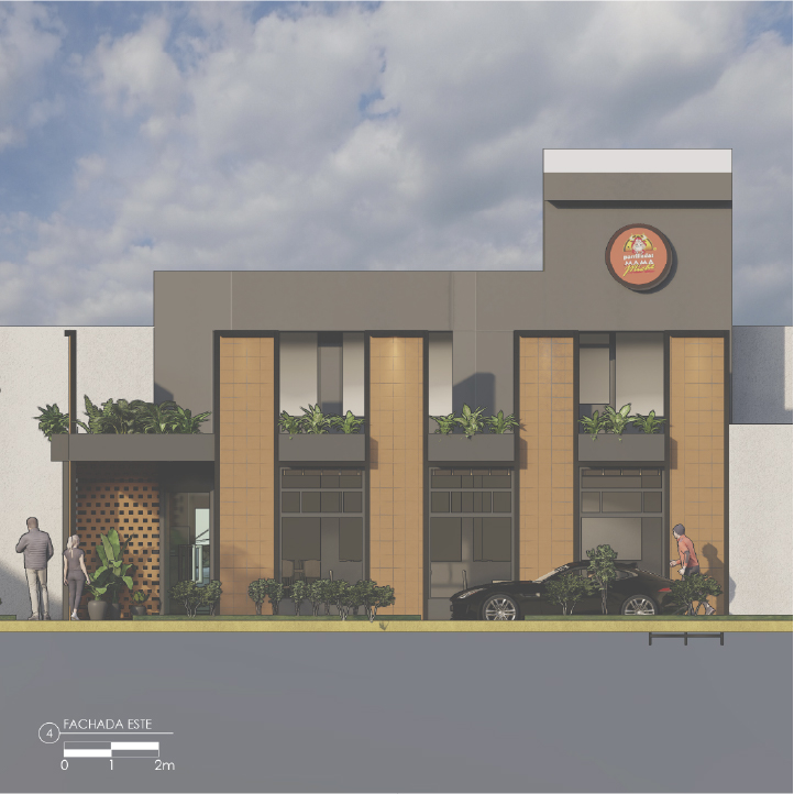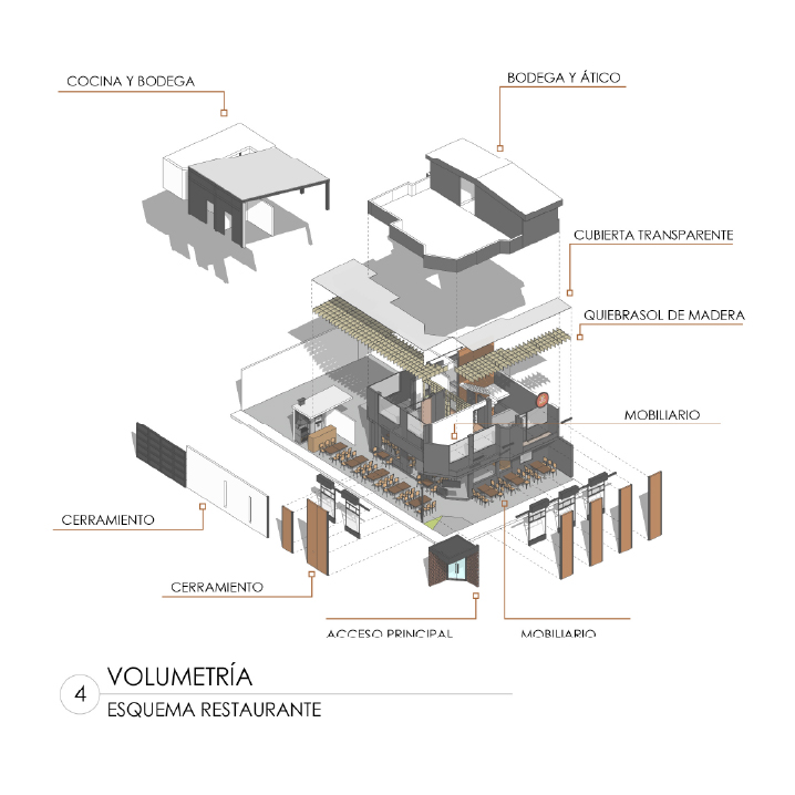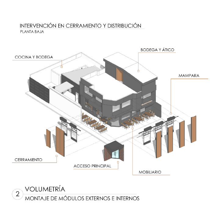 Es un proyecto realizado sobre la base de una construcción de vivienda, es decir, es un reciclaje de estructura que impuso el reto de aprovechar espacios de vivienda como los patios, generar una fachada envolvente y atractiva que sea el foco de atención y que minimice la construcción, la cual fue pintada de negro; como elemento principal de la fachada propusimos seis paredes elevadas de mampostería rústica y tejuelo, que le otorgan personalidad y marcan el estilo del restaurante, siendo un distintivo único entre las construcciones del sector. Al ingreso, puertas de vidrio y un muro de ladrillo visto generan una cálida bienvenida. En el interior del restaurante se planteó la utilización de los patios circundantes para extender el área de mesas para atención al cliente. Para cubrir el área y generar un ambiente térmico, se utilizaron pérgolas sobre la base de estructura metálica vista que aportan estéticamente al ambiente interno del restaurante.