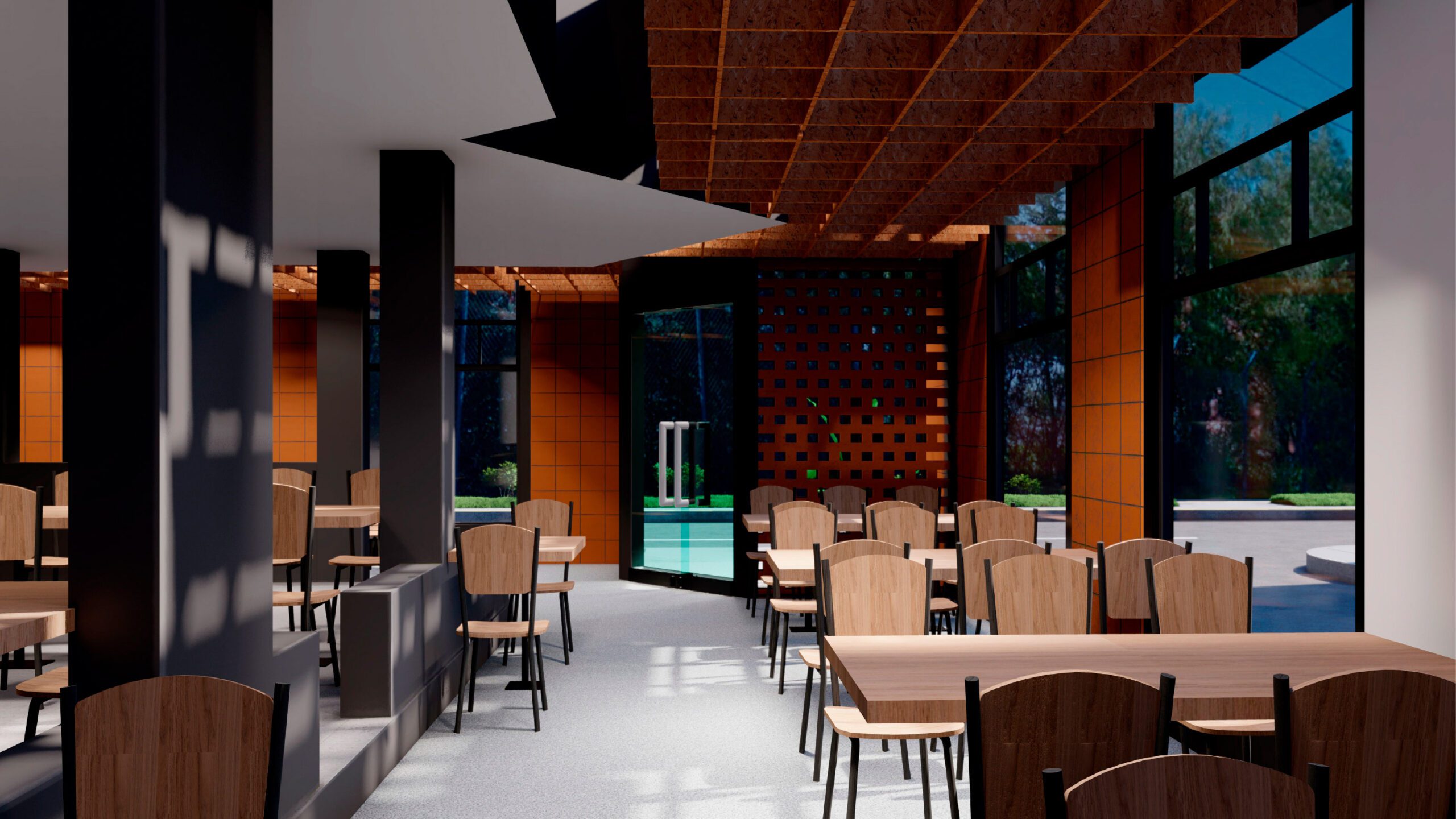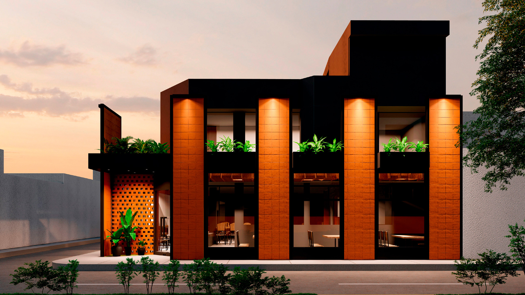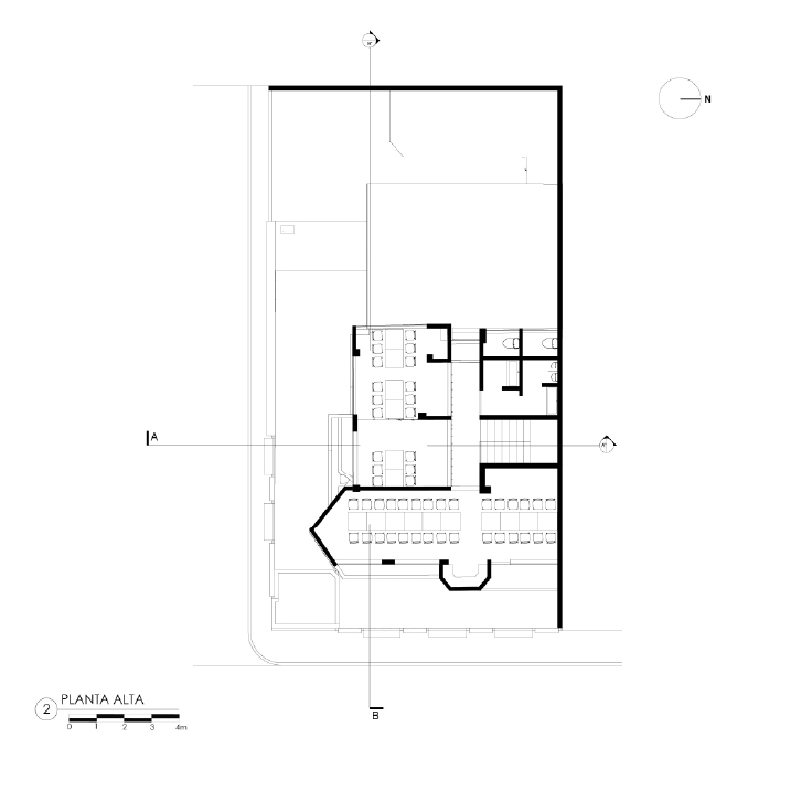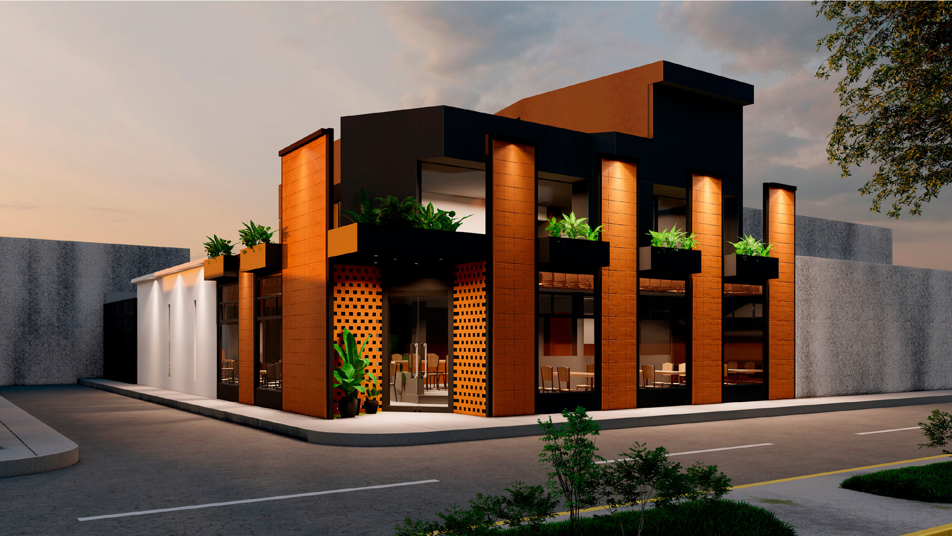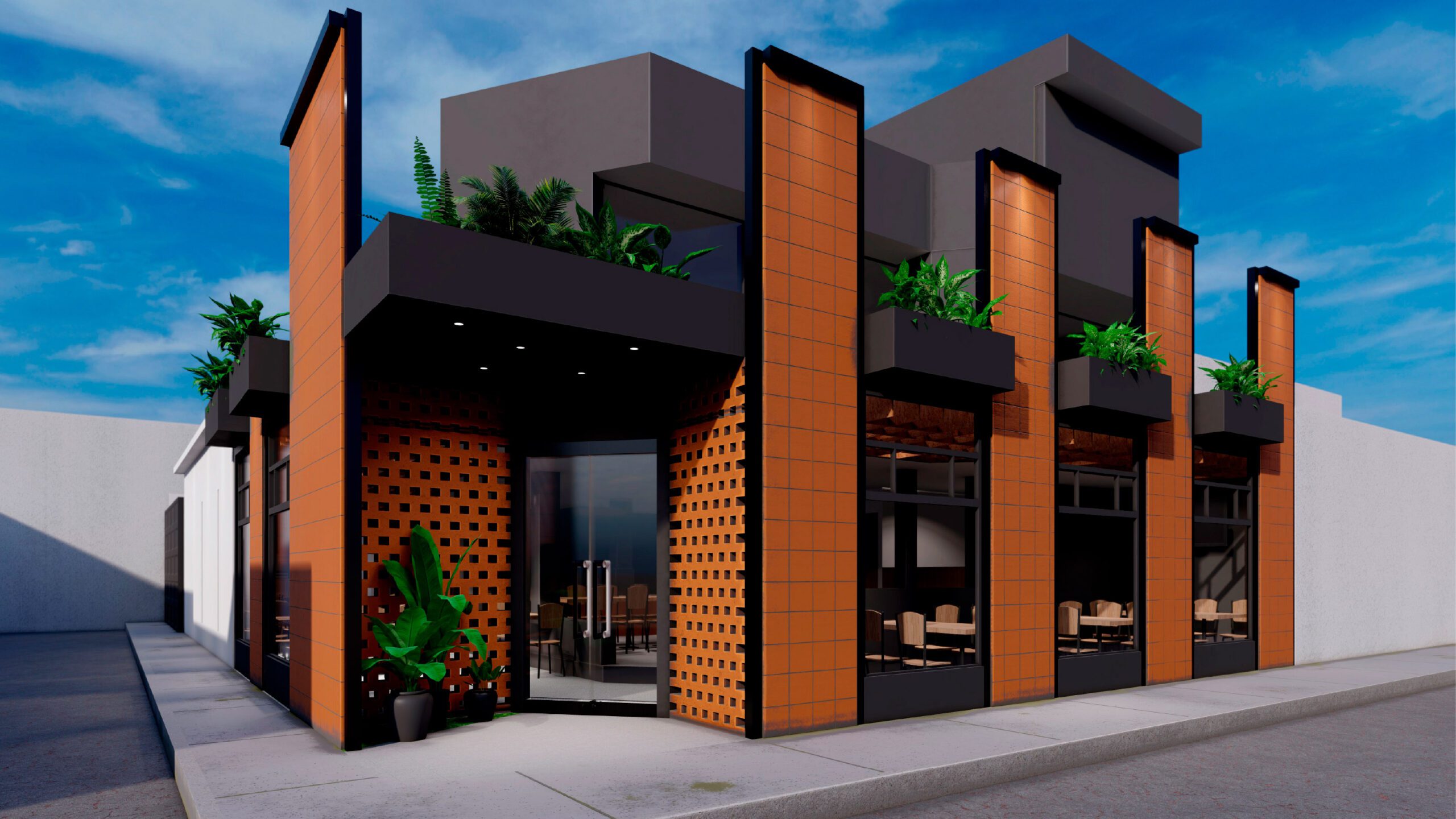 Es un proyecto realizado sobre la base de una construcción de vivienda, es decir, es un reciclaje de estructura que impuso el reto de aprovechar espacios de vivienda como los patios, generar una fachada envolvente y atractiva que sea el foco de atención y que minimice la construcción, la cual fue pintada de negro; como elemento principal de la fachada propusimos seis paredes elevadas de mampostería rústica y tejuelo, que le otorgan personalidad y marcan el estilo del restaurante, siendo un distintivo único entre las construcciones del sector. Al ingreso, puertas de vidrio y un muro de ladrillo visto generan una cálida bienvenida. En el interior del restaurante se planteó la utilización de los patios circundantes para extender el área de mesas para atención al cliente. Para cubrir el área y generar un ambiente térmico, se utilizaron pérgolas sobre la base de estructura metálica vista que aportan estéticamente al ambiente interno del restaurante.